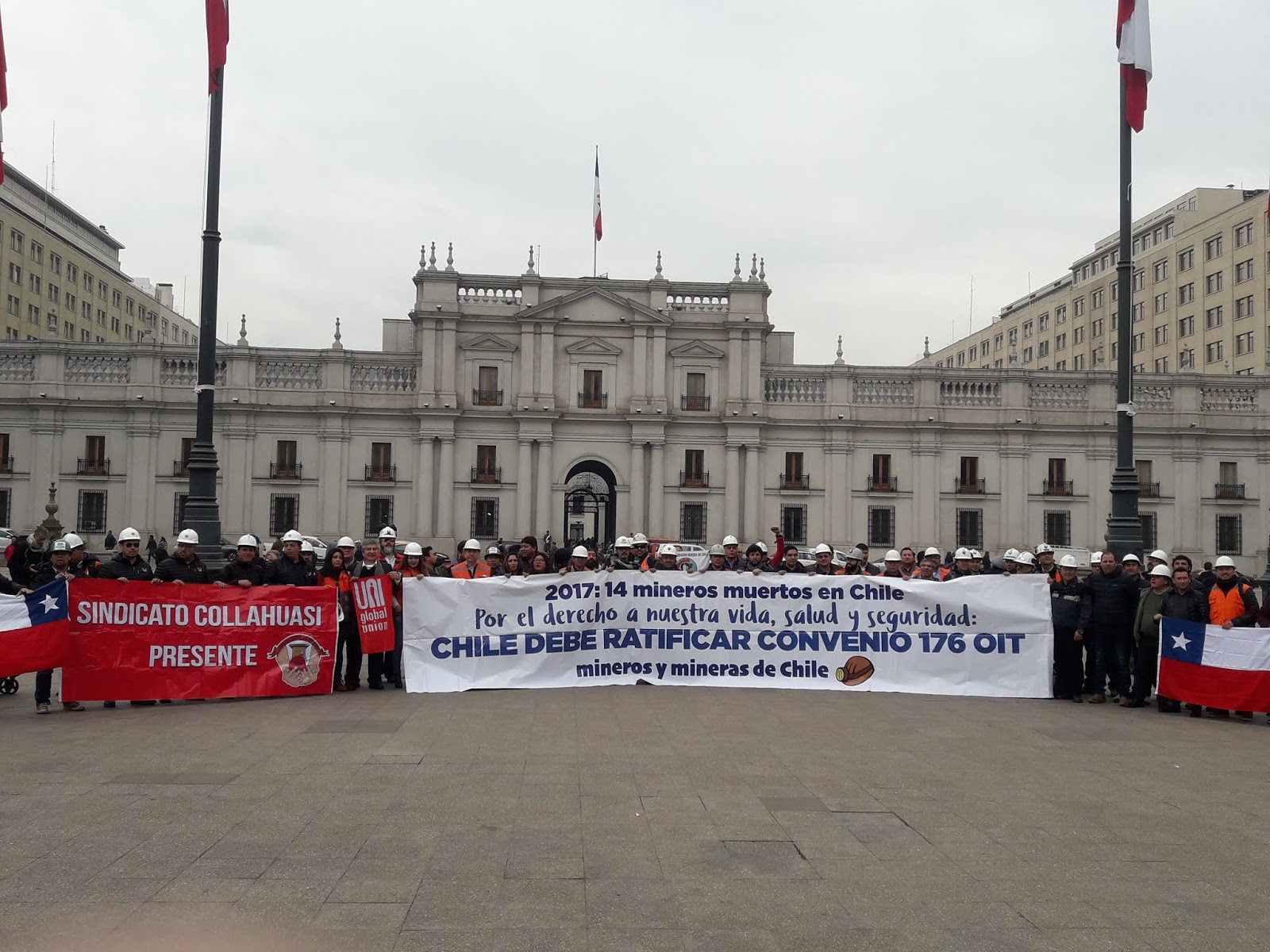 En la plaza de la Constitución, a las 11 de la mañana, fue la cita para decenas de dirigentes sindicales que agrupados en la Coordinadora de Trabajadores de la Minería, CTMIN, se dirigieron a la Moneda con un sólo objetivo: entregar una carta al presidente Piñera en la cual exigen que se ratifique el Convenio 176 de la OIT, sobre Seguridad y Salud en Minas.